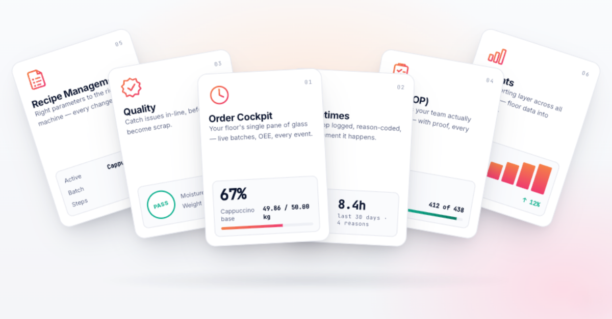 All modules feed into one shared reporting layer: every stop, every quality result, every order confirmation captured automatically and available in one place.